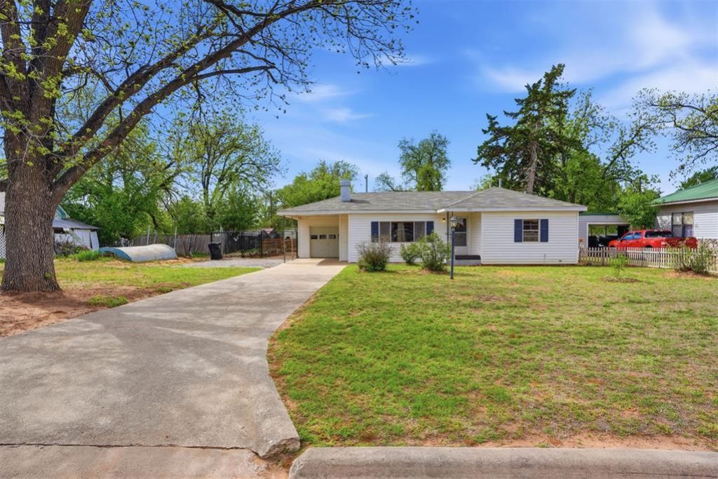 Charming 2 bedroom, 1 bathroom home with a versatile drive-through 1 car garage-perfect for added convenience and accessibility. Step inside to a welcoming living room featuring a cozy gas log fireplace and ceiling fan. The living room, hallway, and both bedrooms showcase beautiful original hardwood floors, while the dining area, kitchen, and bathroom are finished with durable tile flooring. The kitchen is equipped with solid surface countertops, a stylish tile backsplash, gas stove, and a refrigerator that is only 3 years old. Major system updates provide peace of mind, including plumbing replaced from the home to the main line in March 2026, a water heater installed in 2020, HVAC system updated in 2023, and additional insulation added in 2023 for improved energy efficiency. Outside, the property is fully enclosed with a 6' wrought iron and chain link fence (installed in 2023), offering both security and curb appeal. The backyard features an apple tree and plenty of space to enjoy. A carport is attached to both the garage and the home, adding extra covered parking and convenience. Don't miss this great opportunity for a move-in ready home that could be yours!